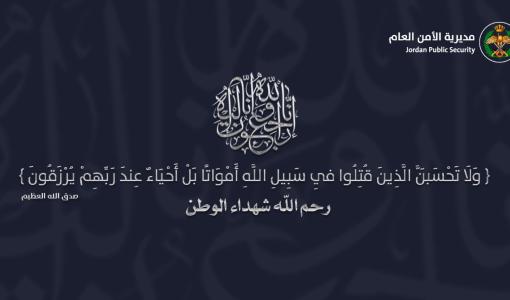 جددت مديرية الأمن العام نعي استشهاد كل من النقيب غيث قاسم الرحاحلة، والملازم ثاني معتز موسى النجادا، والعريف إبراهيم عاطف الشقارين، والذي