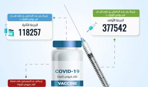 377542 شخصاً حصلوا على الجرعة الأولى من لقاح كورونا 2021-04-06 20:21 أعلنت خلية الأزمة في المركز الوطني للأمن وإدارة الأزمات، أن إجمالي عدد الحاصلين على الجرعة الأولى من لقاح كورونا بلغ 377542 شخصاً، في حين محلي