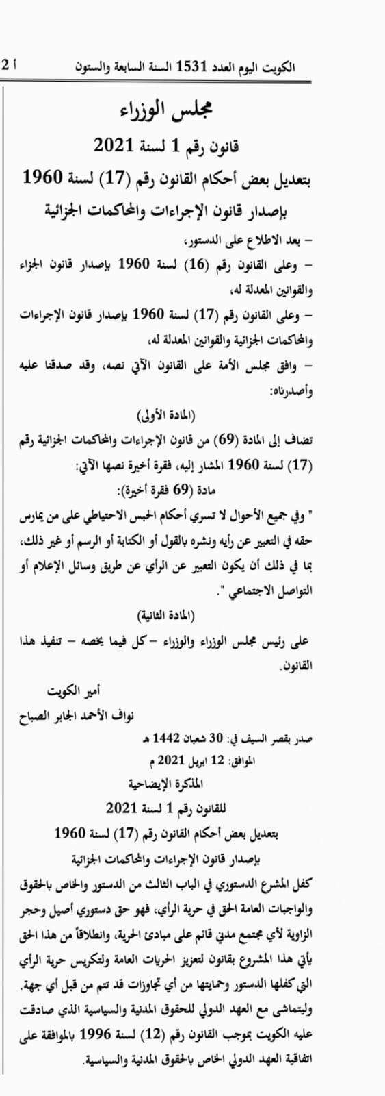 ألغت الكويت الحبس الاحتياطي في قضايا الرأي والتعبير في الإعلام والتواصل الاجتماعي، بعد التعديلات التي أجريت على قانون الإجراءات والمحاكمات الجزائية رقم 17 لسنة 1960.