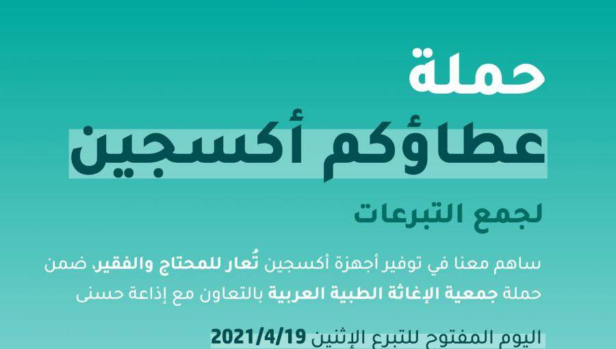 تقيم جمعية الإغاثة الطبية العربية Arabian Medical Relief AMR بالتعاون مع إذاعة حسنى إف إم، الإثنين المقبل، 19 نيسان، يوماً مفتوحاً لجمع التبرعات ضمن حملة "عطاؤكم أكسجين" والتي تعنى بإعارة وتوفير أجهزة الأكسجين للمحتاجين والفقراء وذلك في مرحلة التعافي من فيروس كورونا.