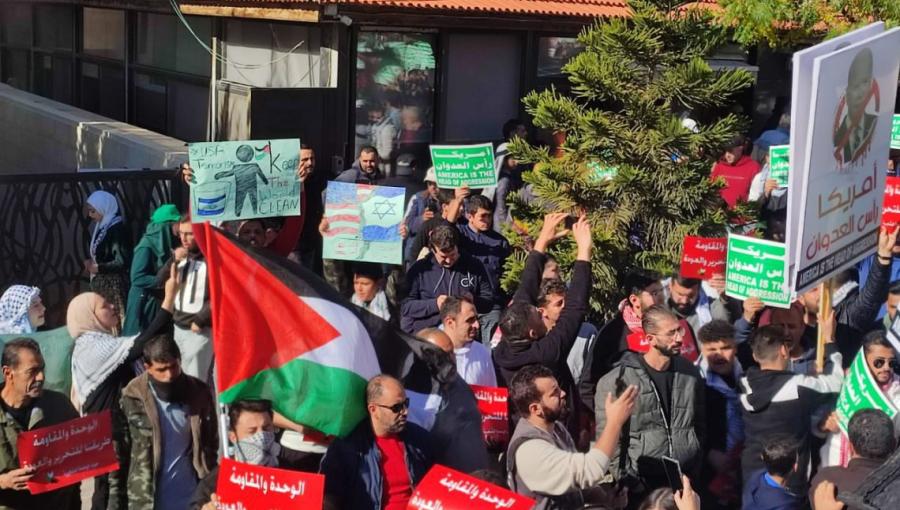 ورفع المشاركون لافتات تؤكد أن أمريكا شريكة في المجازر التي يرتكبها جيش الاحتلال بسلاح وقنابل واشنطن وقرارها باستمرار العدوان البربري وعدم وقف إطلاق النار رغم كل المواقف الدولية والأممية المطالبة بذلك.