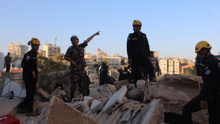 تواصل كوادر الدفاع المدني عملية البحث عن محاصرين من حادثة انهيار عمارة عصر اليوم في منطقة اللويبدة مكونة من 4 طوابق.