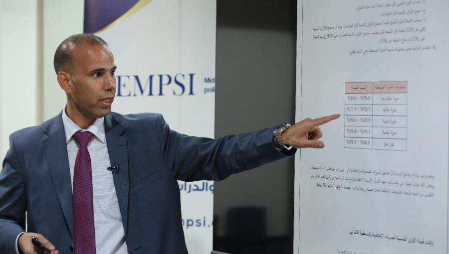 وتبين أن المؤشر العام لمقياس الحريات الإعلامية العامة بلغ (42.1 %)، وبهذا فإن الحريات الإعلامية ضمن نطاق الحرية النسبية علماً بأن مستوى الحرية النسبية يقع بين (39,5% - 59,6%)، فيما مستوى الحريات الصحفية يقع ما بين (حرية عالية جدا، وعالية، ونسبية، ومتدنية)