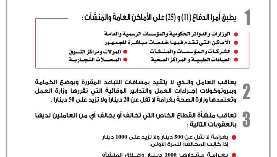 الى ذلك تم التعميم على المؤسسات لتطبيق اوامر الدفاع وبالذات (11)و(25) على الاماكن العامة والمنشآت،بحيث تفرض عقوبات على غير الملتزمين بغرامة لا تقل عن 500 دينار على المؤسسات التجارية الخاصة ولا تزيد عن 1000 دينار اذا كانت المخالفة للمرة الاولى ،و الف دينار واغلاق المنشأة سبعة ايام في حال التكرار.،فيما يعاقب الافراد بغرامة من 20 الى 50 دينار ا في حال عدم لبس الكمامة والالتزام بالتباعد.