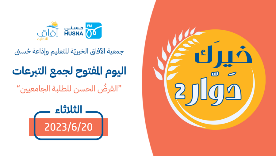 تقيم جمعية الآفاق الخيرية للتعليم وبالتعاون مع إذاعة حسنى، غداً الثلاثاء، يوماً مفتوحاً لجمع التبرعات ضمن حملة "خيرك دوار" والتي يعود ريعها لتعليم طلبة الجامعات الأردنية.