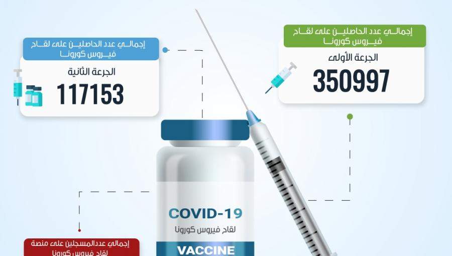 نشر المركز الوطني للأمن وإدارة الأزمات عبر صفحته على فيسبوك آخر التحديثات الإحصائية المتعلقة بالحملة الوطنية للتطعيم ضدّ فيروس كورونا، حيث بلغ إجمالي عدد الحاصلين على الجرعة الاولى من لقاح فيروس كورونا 350997 شخصاً.