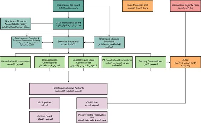 سلطة غزة الدولية الانتقالية (GITA) ستكون تحت إشراف مجلس مكون من 7 إلى 10 أعضاء دوليين، من بينهم ممثل واحد فلسطيني، ومسؤول أممي رفيع، وشخصيات متعددة الجنسيات تمارس الإدارة التنفيذية أو المالية، وحرصت المبادرة على ضمان نسبة تمثيل من الدول الإسلامية لتعزيز الشرعية الإقليمية والثقافية والقبول للمقترح. وتشير التقارير إلى أن السلطة الدولية ستكون تحت إدارة توني بلير كـ"مندوب سامي" يمثل هذا التجمع الدولي ويخدم مصالح الاتفاق وتأكيد انتقال السلطة للهيئة.