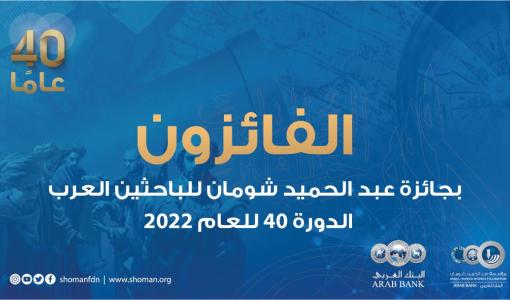 أعلنت مؤسسة شومان اليوم، عن فوز 17 باحثا بجائزتها للباحثين العرب، في دورتها الـ (40) للعام 2022، حيث توزعت جنسيات الباحثين بين 7 أردنيين، 3
