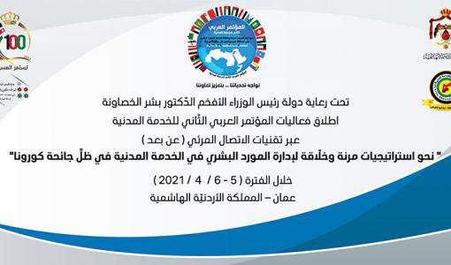 المؤتمر العربي الثاني لأجهزة الخدمة المدنية يختتم أعماله اليوم 2021-04-06 11:18 يُختتم اليوم في العاصمة عمّان، المؤتمر العربي الثاني لأجهزة الخدمة المدنية و التي انطلقت أمس (الإثنين) عبر تقنيات الاتصال المرئي عن بعد، محلي