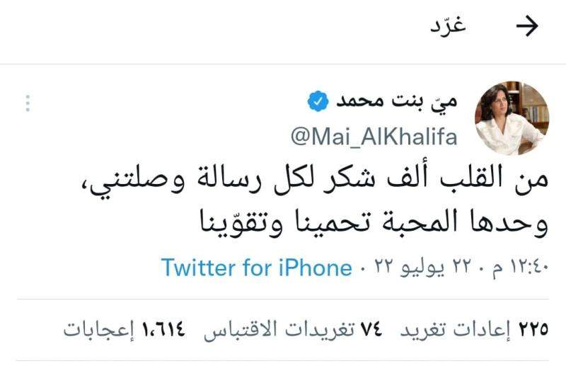 الشيخة مي وفي تغريدة على حسابها الرسمي على موقع تويتر، قالت أمس الجمعة، "من القلب ألف شكر لكل رسالة وصلتني، وحدها المحبة تحمينا وتقوّينا"، وذلك في أعقاب ما تم تداوله عبر وسائل الإعلام عن نبأ إقالتها المفاجئة، دون التطرق صراحة إلى حيثيات القرار.