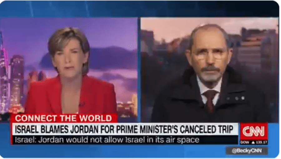 قال وزير الخارجية أيمن الصفدي خلال مقابلة مع الـ( CNN )اليوم ، أنه لا يمكن توقع موافقتنا أن يطير "نتنياهو" فوق الأجواء الأردنية بعد قيامه بعرقلة زيارة دينية لولي العهد الأمير الحسين بن عبد الله الثاني ، إلى المسجد الأقصى للصلاة فيه بمناسبة ذكرى الإسراء والمعراج.